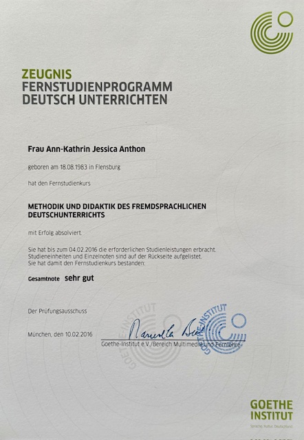 Ann-Kathrin ist eine großartig Lehrerin. Auf jedenfalls ist sie sehr Kompetent und freundlich. Für ein Jahr hat sie mich Deutch Unterricht gegeben. Ich habe nur gute Dinge darüber zu sagen, weil ich alle mein Ziel erreicht habe. Dringend empfehle ich Ann-Kathrin als Lehrerin.